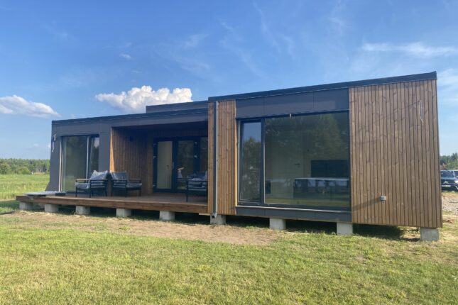 A modern style fully finished and equipped modular residential buildings and holiday homes are prefabricated buildings built indoors in a factory-like setting. The modular home is a building unit measuring a few dozen square meters that is constructed and fully equipped with nearly all facilities at our factory. Modules are usually manufactured using a high-quality C24 carcassing timber together with high-quality insulation, like stone wool or polyurethane foam. The objectives concerning the high-level stability of a building, environmental friendliness, and good thermal insulation are equally fulfilled. Modular homes are equipped with interior and exterior decoration, installations, and communications. All the work that is carried out during the production and installation process of the module is thoroughly checked and verified. A product passport is issued and a unique module number is provided for warranty and post-warranty service at the departure of each module from the factory to the customer. The production process is carried out according to ISO 9001 requirements.